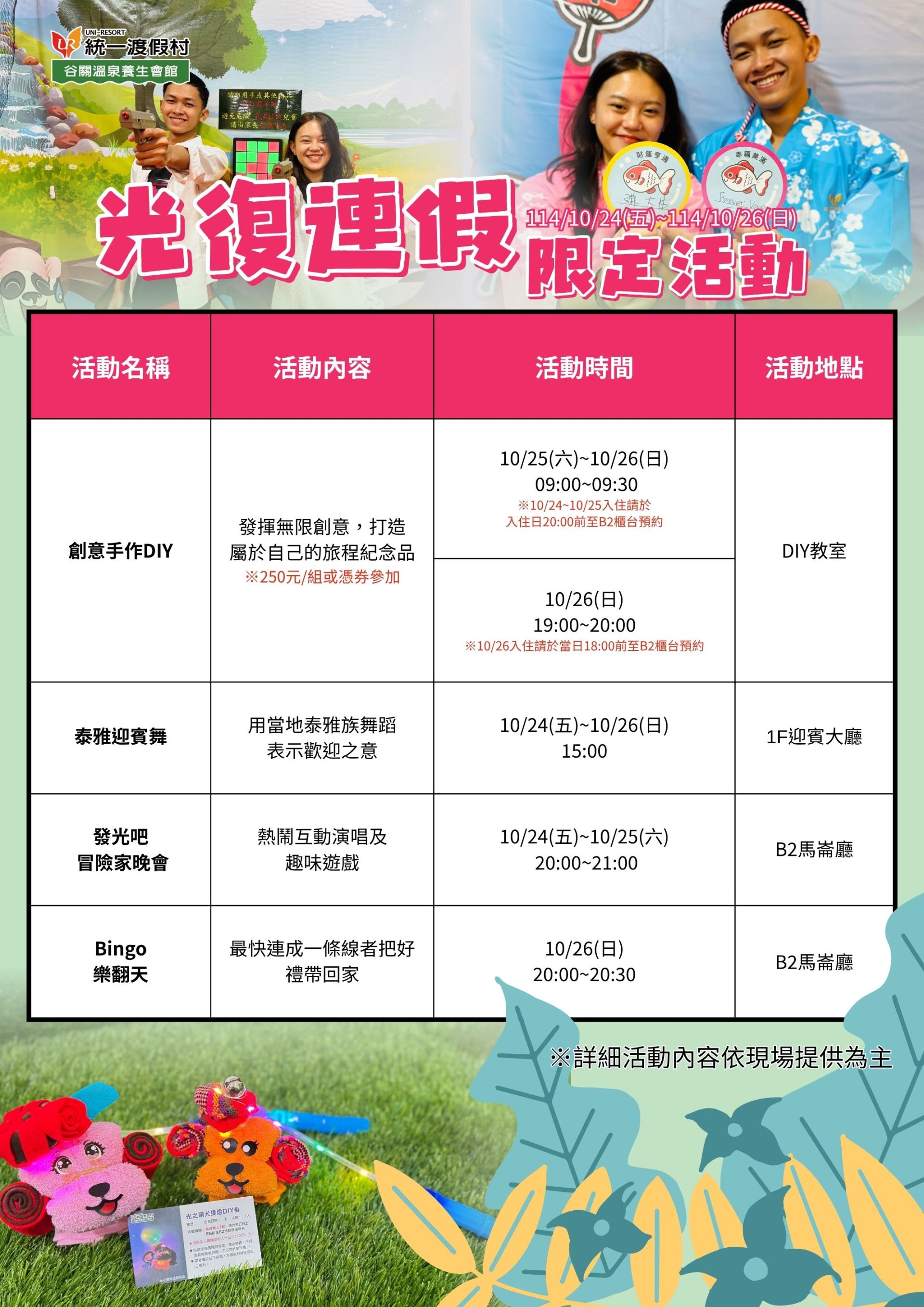 冬日泡湯頂級享受!10/1~12/31入住統一谷關飯店,寒冷季節首選溫泉飯店度過假期,統一谷關美食及特色溫泉五行湯,優惠住宿更帶給您美好體驗。全新星願湯饗活動,入住飯店泡湯賞景許下美好星願,入住扭蛋抽幸福小語、手作光之萌犬提燈,全新打卡牆及專用拍照小道具,創造滿滿冬日旅行回憶!