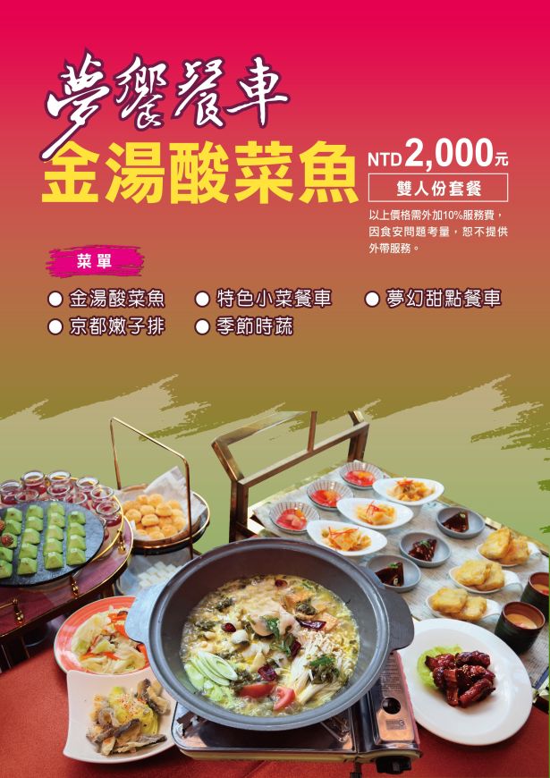 「以鱘龍蝦滑海鮮鍋及三台餐車為主軸,先推出特色小菜車開胃,接著品嘗焗烤鱘龍飯,中間有蔬食沙拉車的精彩桌邊服務,最後用夢幻甜點車作結尾,此外,每台餐車的料理皆可無限續點!」