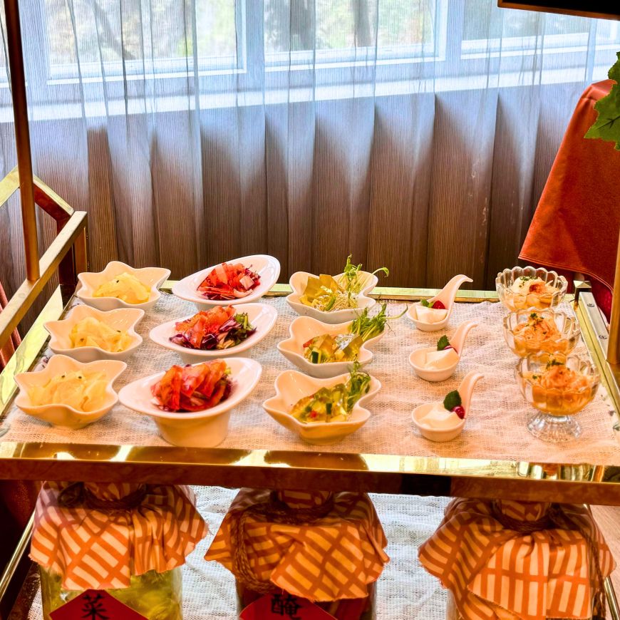 特色小菜餐車 隨著季節更換不同的特色小菜,黃金泡菜、酥炸芋頭糕及酸甜花漾水果凍...等,開胃又不佔胃,可無限續盤。 |